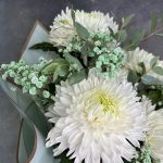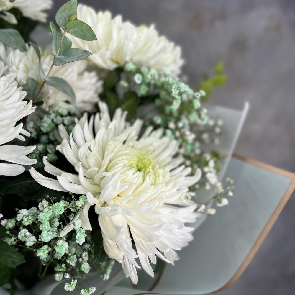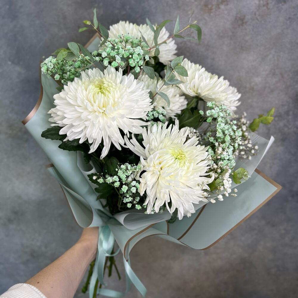 Эвкалипт – 2 шт.Лента атласная – 1 шт.Упаковка дизайнерская – 2 шт.гипсофила радужная – 2 шт.хризантема магнум белая – 5 шт.