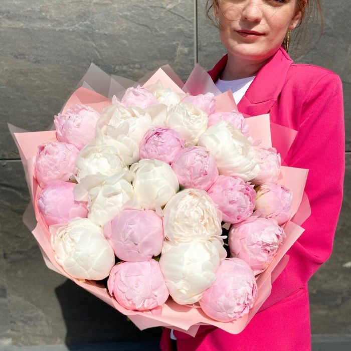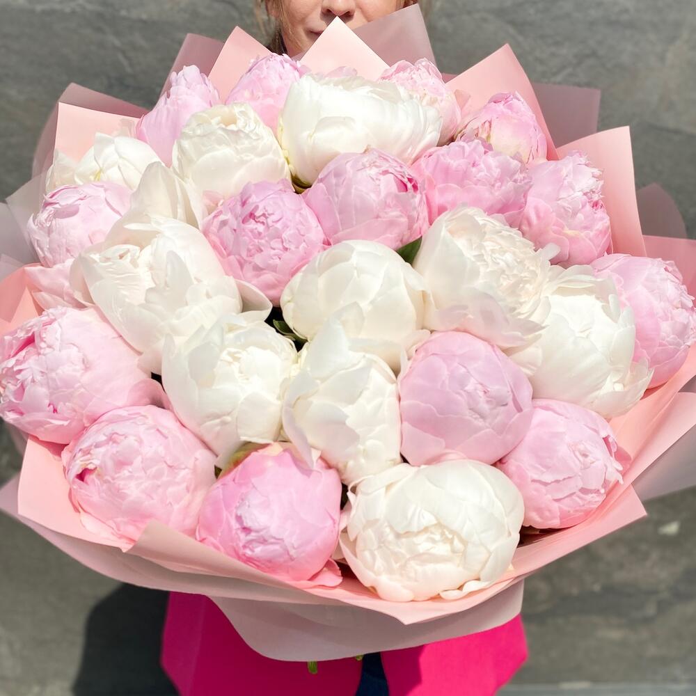 Лента атласная – 1 шт.Упаковка дизайнерская – 9 шт.пион пиллоу толк – 15 шт.пион мадам клод тейн белый – 10 шт.