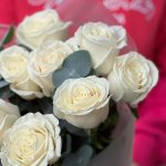 Эвкалипт – 1 шт.Упаковка дизайнерская – 1 шт.роза плая бланка премиум 70 см – 11 шт.