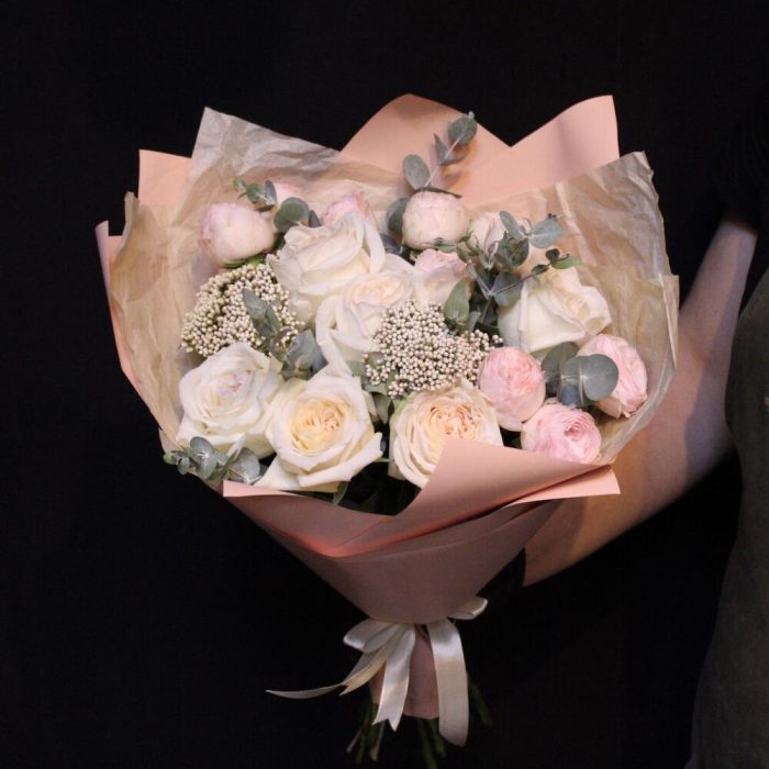 роза кустовая пионовидная mansfield park – 3 шт.роза пионовидная white o’hara – 6 шт.Озотамнус – 2 шт.Эвкалипт – 2 шт.Тишью – 2 шт.Пленка дизайнерская – 2 шт.Лента атласная – 1 шт.