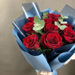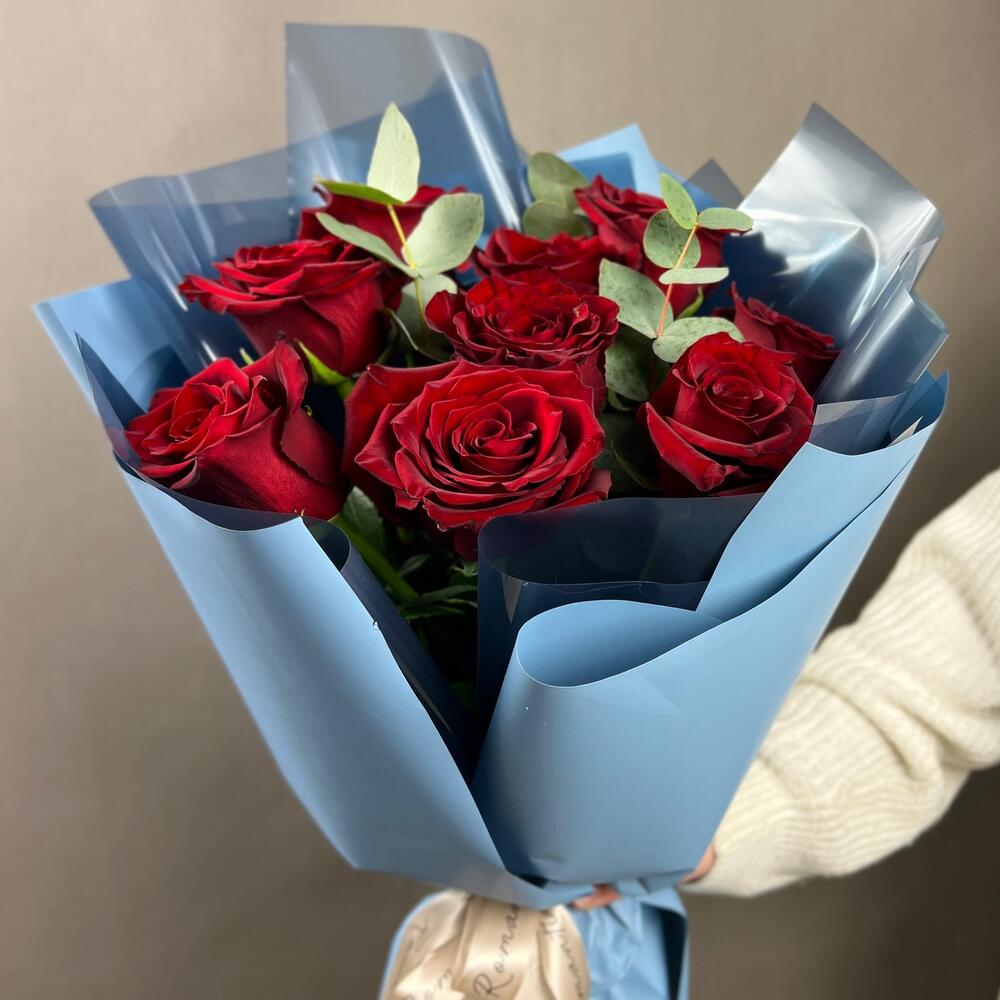 Букет из 9 бордовых роз с эвкалиптом