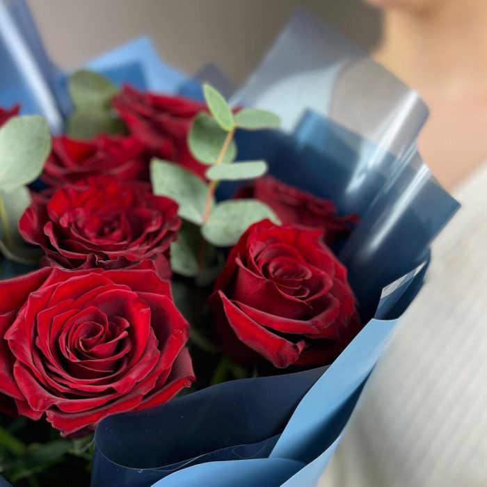 Эвкалипт – 3 шт.Лента атласная – 2 шт.Пленка матовая – 5 шт.Роза эксплорер 50 см – 9 шт.пленка полупрозрачная – 4 шт.