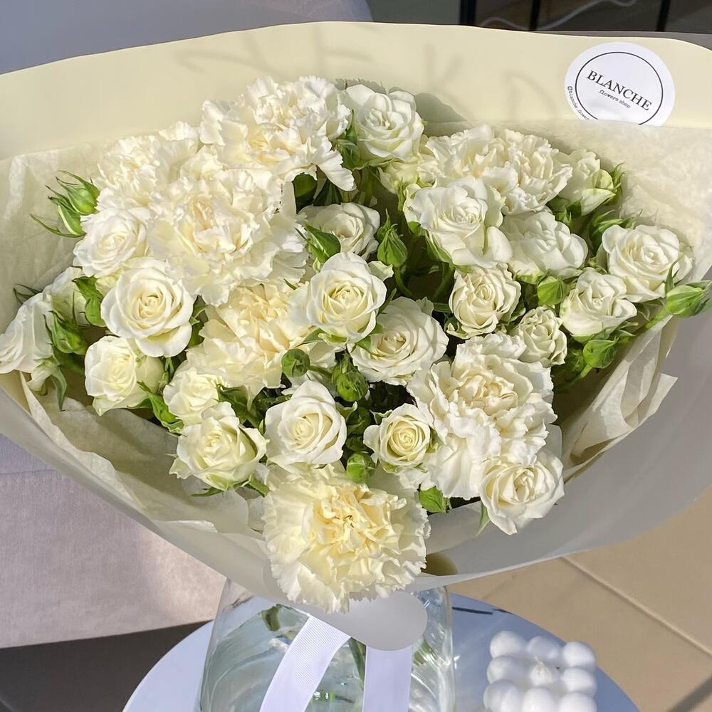 Кустовая роза белая – 5 шт.Фирменная упаковка – 1 шт.диантусы – 7 шт.