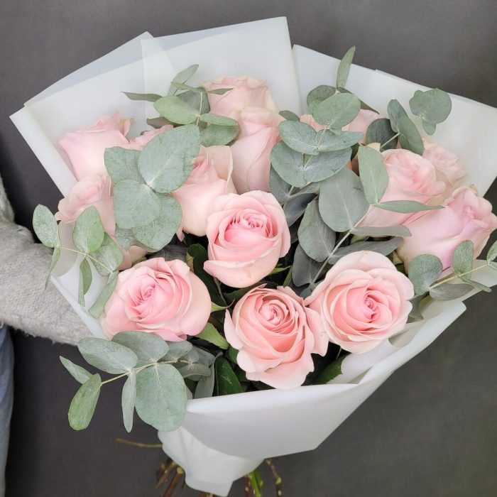 Роза Эквадор – 15 шт.Эвкалипт – 7 шт.Упаковка дизайнерская – 1 шт.Лента атласная – 1 шт.