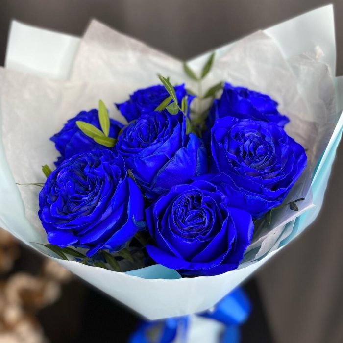 Лента атласная – 1 шт.Тишью – 1 шт.Фисташка – 2 шт.Синяя роза – 7 шт.Матовая упаковка – 1 шт.