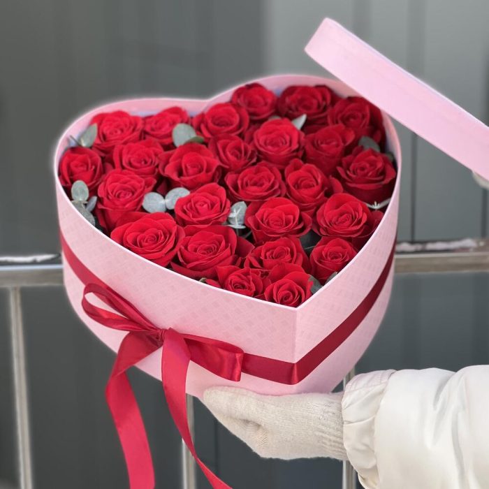 Коробка сердце из 25 красных роз и эвкалипта!