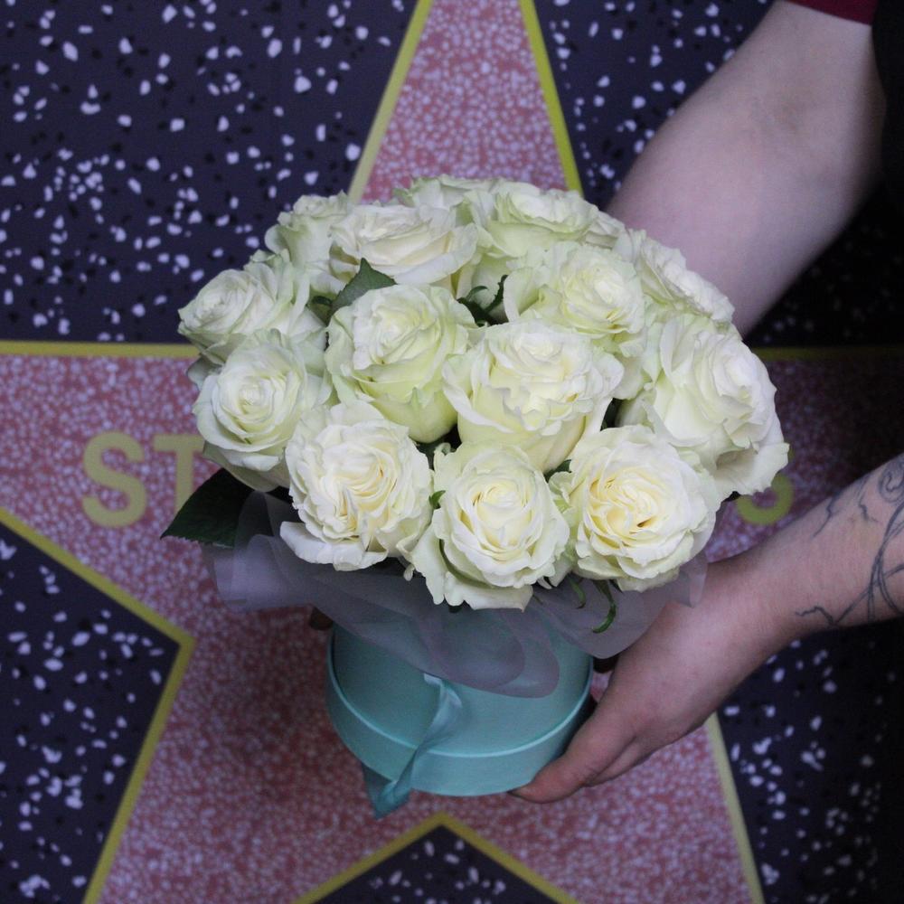 Роза Мондиаль – 15 шт.Пленка дизайнерская – 1 шт.Оазис флористический – 1 шт.Коробка шляпная – 1 шт.