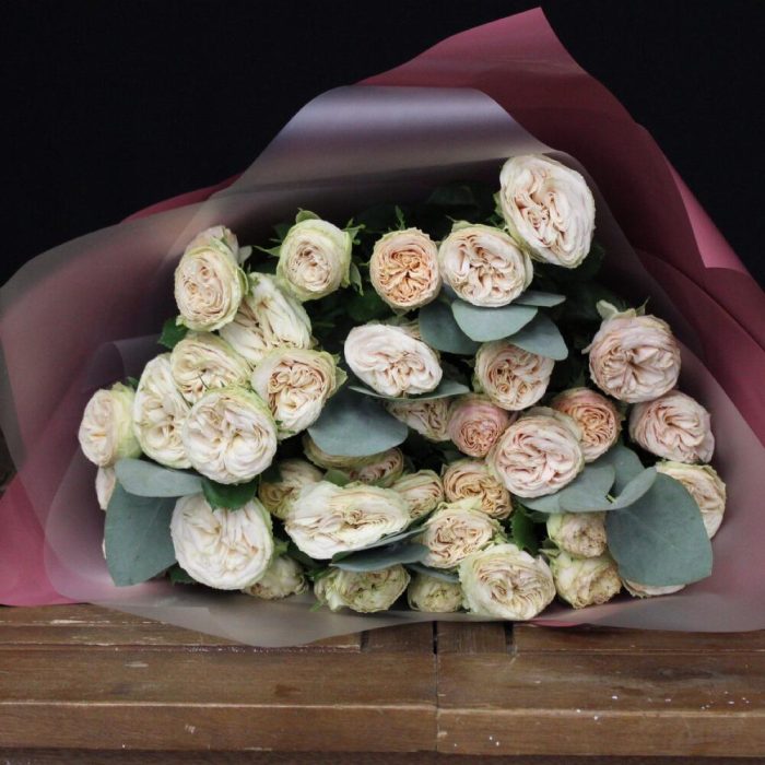 mono bouquet 114 из 7 кустовых пионовидных роз сорта trendsetter с эвкалиптом