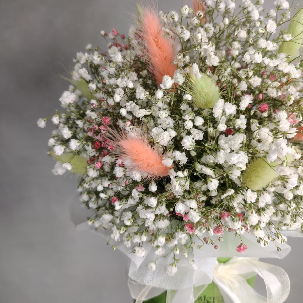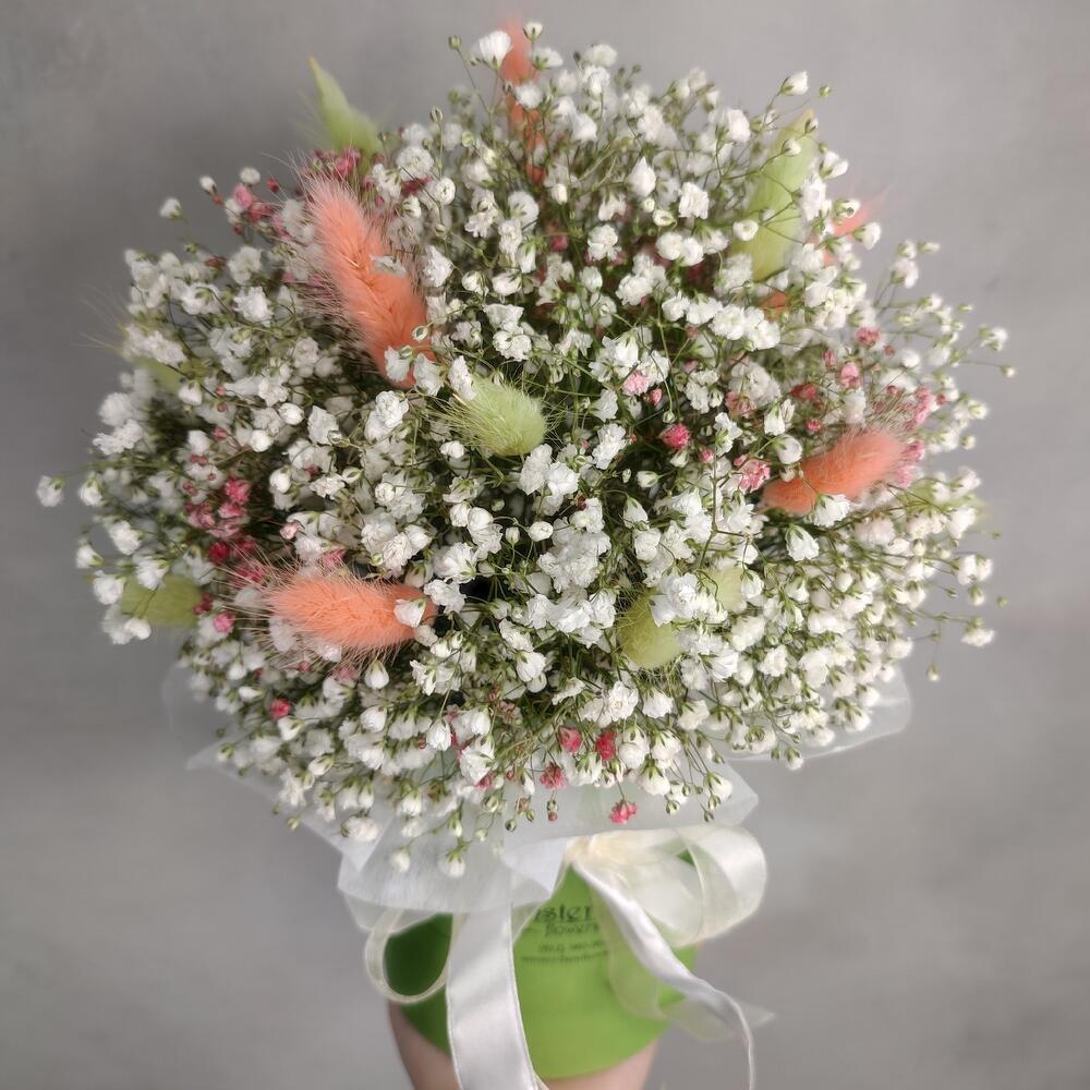 Коробка шляпная – 1 шт.Оазис флористический – 1 шт.Гипсофила – 7 шт.лагурус салатовый – 10 шт.лагурус персиковый – 7 шт.